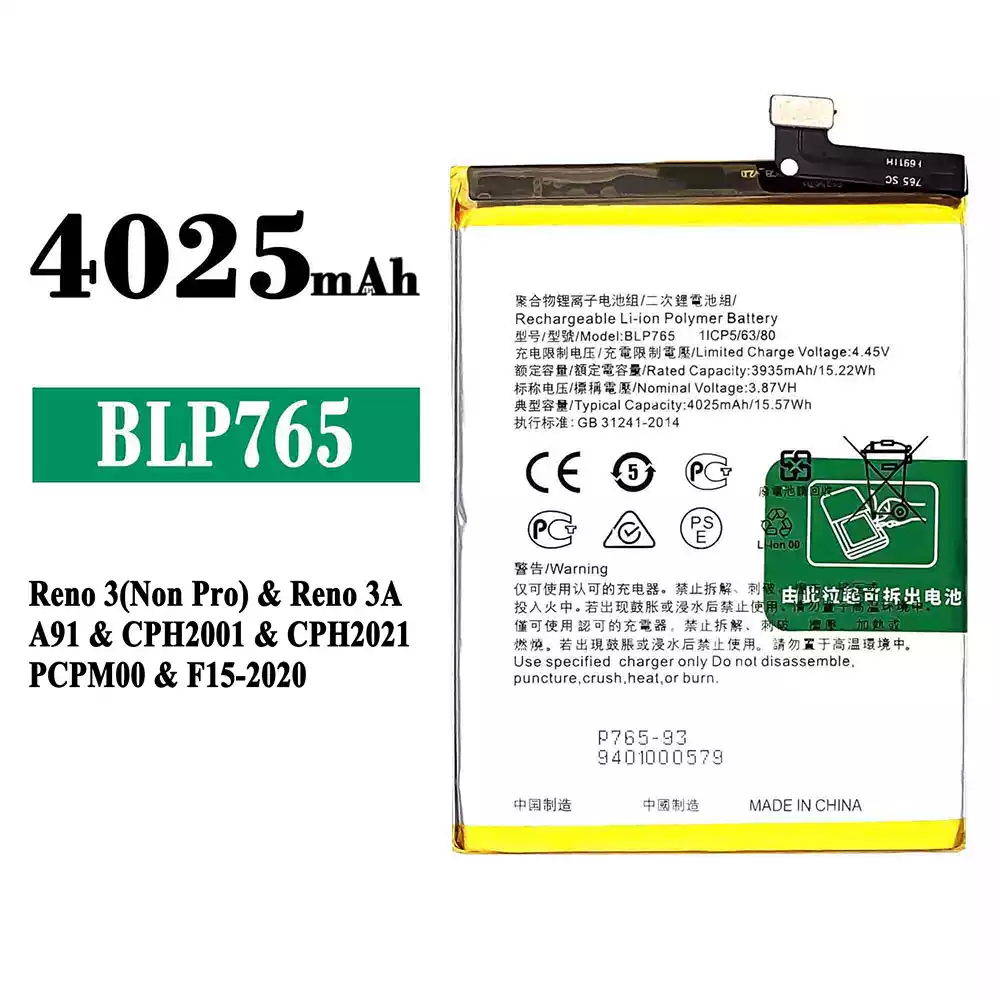 バッテリー BLP765 対応 OPPO Reno 3(Non Pro) / Reno 3A / A91 / CPH2001 / CPH2021 / PCPM00 / F15-2020